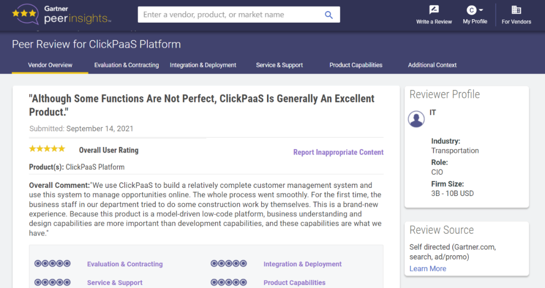 Tips::::::::【Peer Insights】——用户对企业IT产品和服务发布真实评价的平台。。。。。。。目前已有355个市场,,,,,255,000条经过验证的评价。。。。。。。。每一条评价Gartner会针对参评企业营收规模及参评人员信息做验证、、、、、评价内容做多维核实。。。。。。。。